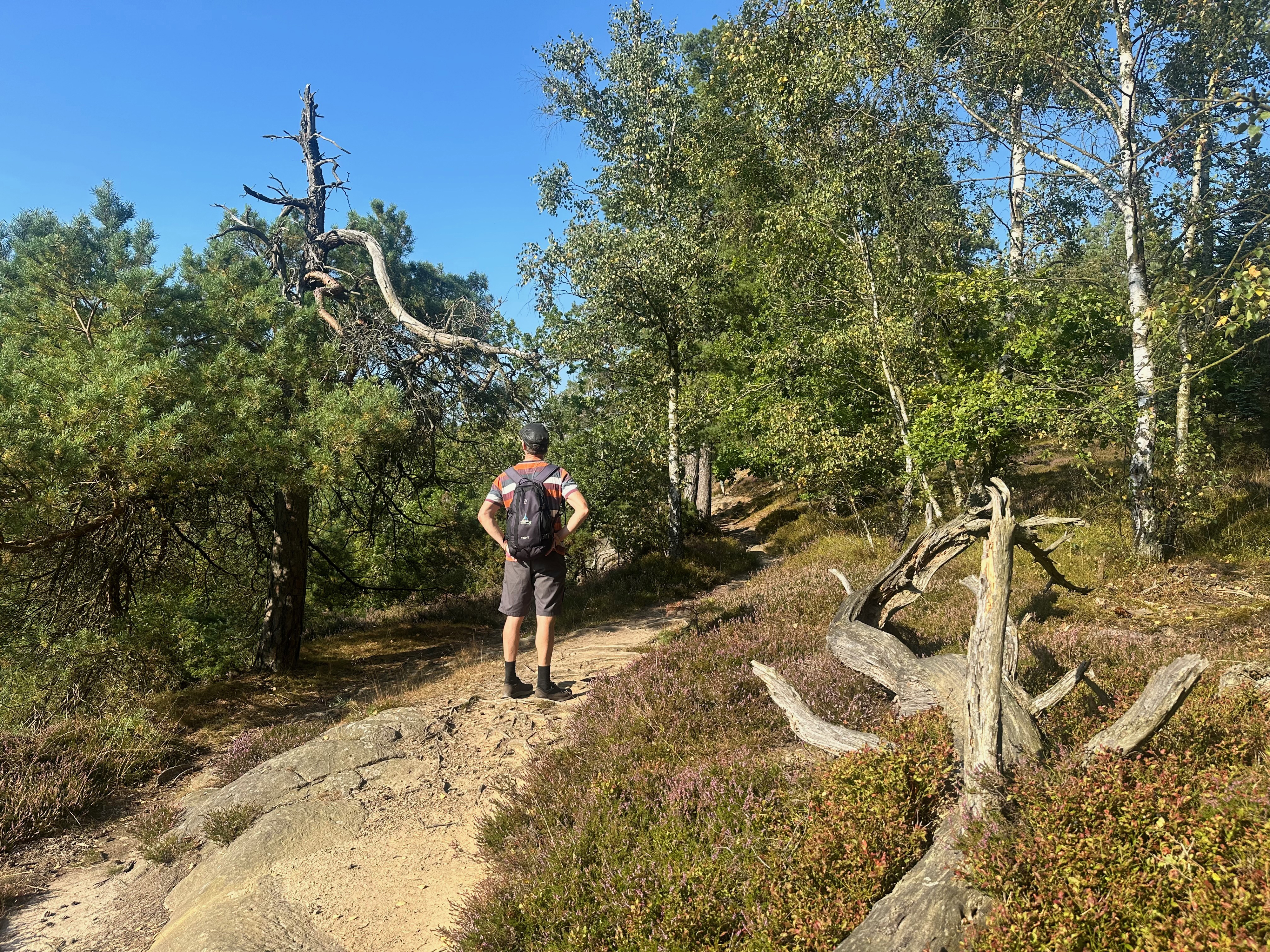 Videre bevæger vi os ind i Paradisbakkerne, hvor landskabet skifter karakter og bliver mere kuperet og åbent. Vi følger stier op mod Midterpilt, områdets højeste punkt, hvorfra der er storslået udsigt over skov, klipper og åbne strækninger. Undervejs passerer vi væltede stenblokke, gamle egetræer og kløfter, der inviterer til opmærksom iagttagelse og rolig fordybelse.